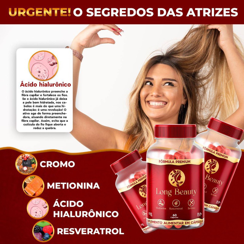 Long Beauty reduz a queda capilar, contribui para a nutrição, crescimento e fortalecimento de cada fio capilar além de tudo isso de bônus ajuda a rejuvenescer a pele!